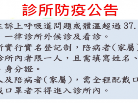 1. 凡主訴上呼吸道問題或體溫超過37.5以上,一律診所外候診及看診。 2. 病人及陪病者(家屬),需全程配戴口罩,未戴口罩者不得進入診所內。 3. 夜診暫時停診,配合疫情。